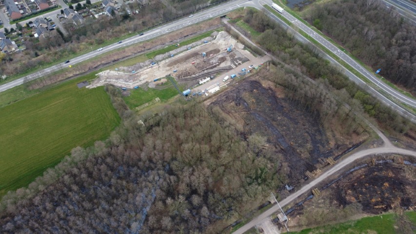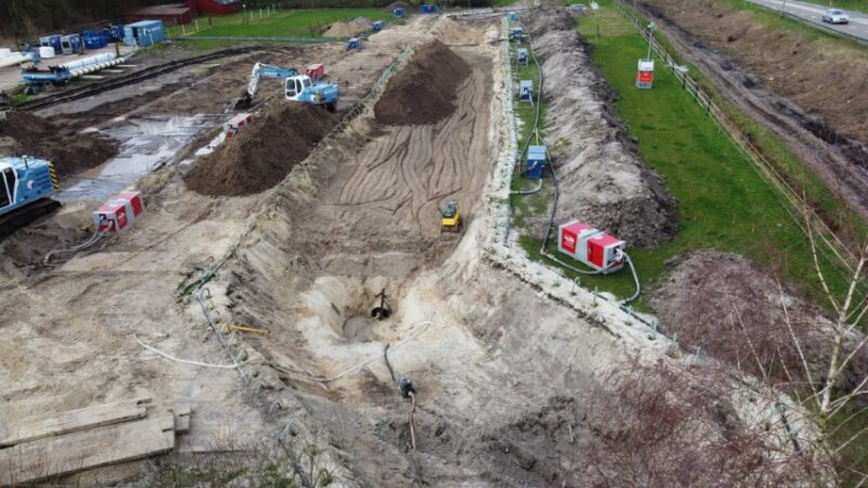 - Rondom het terrein is een tijdelijke drainageslang aangelegd om het grondwaterniveau te verlagen.